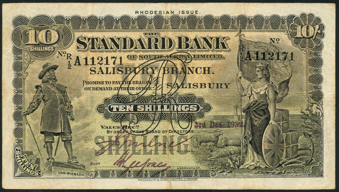 Standard Bank of South Africa, Rhodesian Issue, 10 shillings, Salisbury, 3 December 1932, serial number R 1/2 A115171, black on green and yellow underprint, Van Riebeeck at left, Britannia at right, value at centre and top left and right, reverse green, turreted maiden at centre