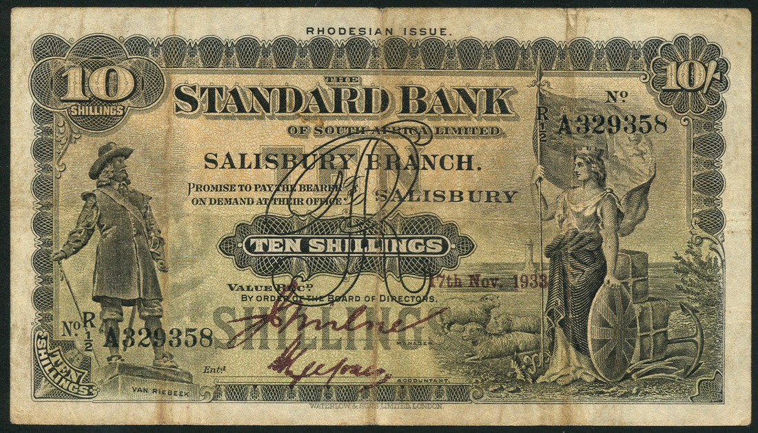 Standard Bank of South Africa, Rhodesian Issue, 10 shillings, Salisbury, 17 November 1933, serial number R 1/2 A329358, black on green and yellow underprint, Van Riebeeck at left, Britannia at right, value at centre and top left and right, reverse green, turreted maiden at centre