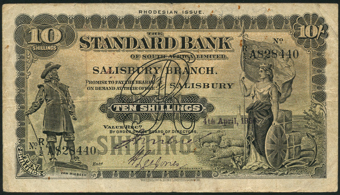 Standard Bank of South Africa, Rhodesian Issue, 10 shillings, Salisbury, 4 April 1936, serial number R 1/2 A828440, black on green and yellow underprint, Van Riebeeck at left, Britannia at right, value at centre and top left and right, reverse green, turreted maiden at centre