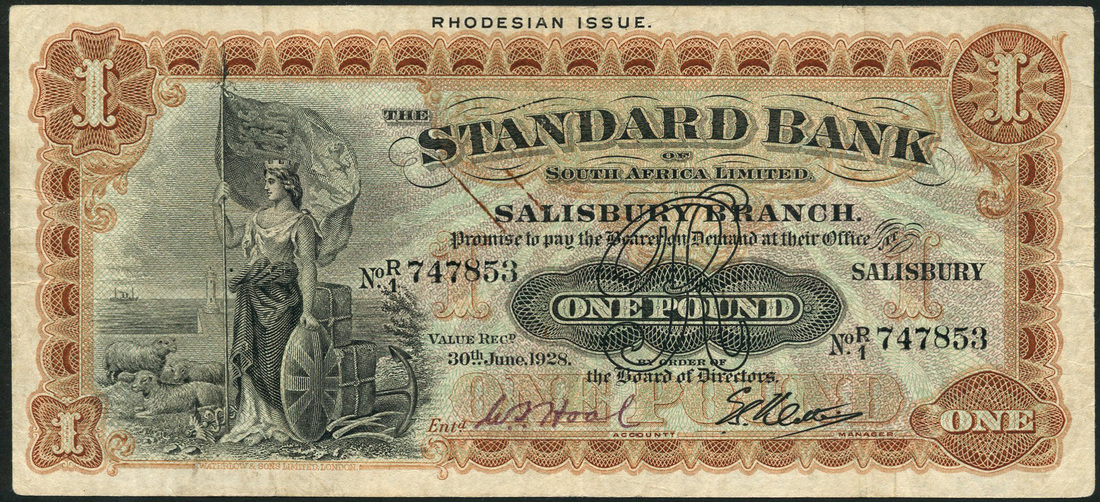 Standard Bank of South Africa, Rhodesian Issue, £1, Salisbury, 30 June 1928, serial number R 1 747853, black and orange-brown on green and red underprint, Britannia at left, value at centre and each corner, reverse brown, turreted maiden at centre