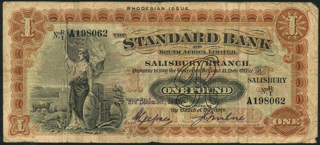 Standard Bank of South Africa, Rhodesian Issue, £1, Salisbury, 3 December 1933, serial number R 1 A198062, black and orange-brown on green and red underprint, Britannia at left, value at centre and each corner, reverse brown, turreted maiden at centre