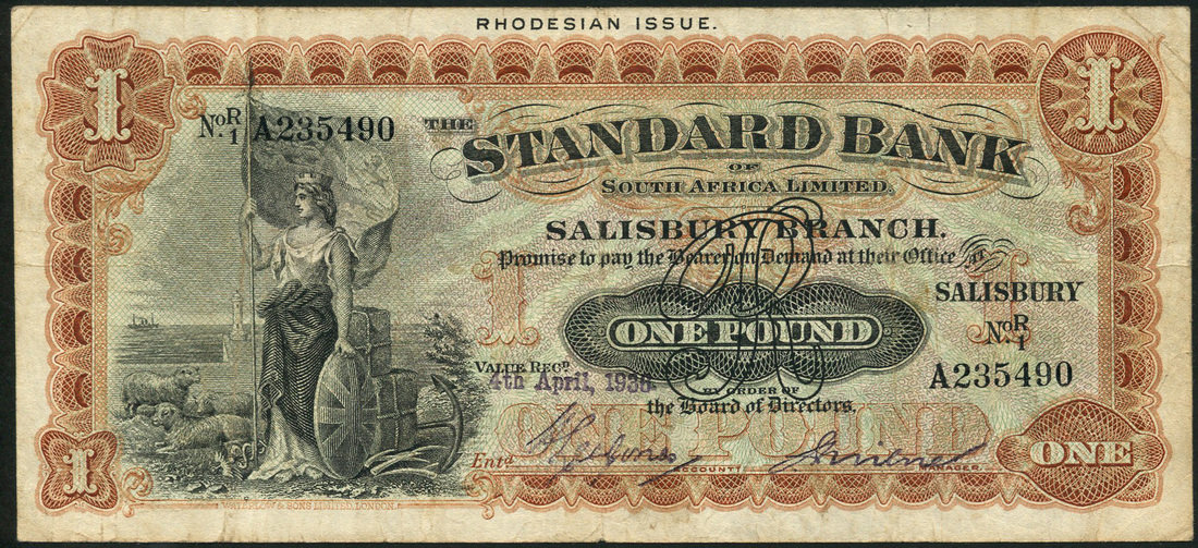 Standard Bank of South Africa, Rhodesian Issue, £1, Salisbury, 4 April 1936, serial number R 1 A235490, black and orange-brown on green and red underprint, Britannia at left, value at centre and each corner, reverse brown, turreted maiden at centre