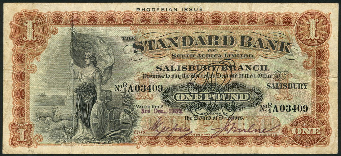Standard Bank of South Africa, Rhodesian Issue, £1, Salisbury, 3 December 1932, serial number R 1 A03409, black and orange-brown on green and red underprint, Britannia at left, value at centre and each corner, reverse brown, turreted maiden at centre