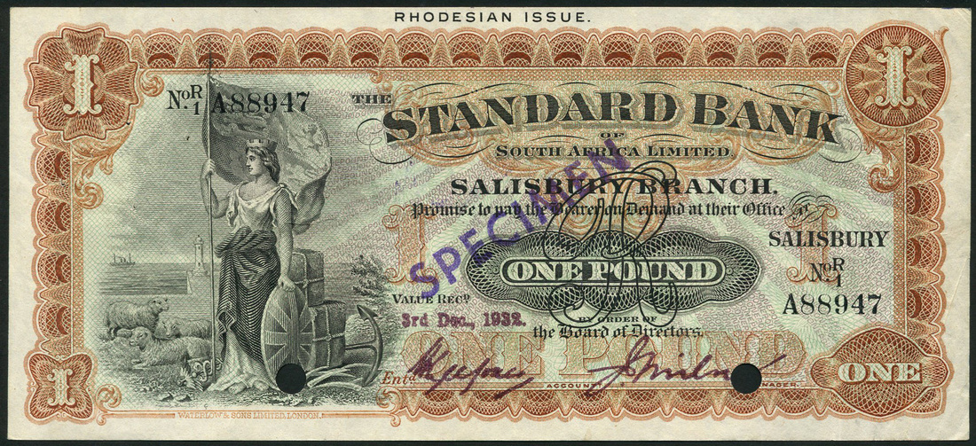 Standard Bank of South Africa Limited, Rhodesia, specimen £1, Salisbury, 3 December, serial number R/1 A88947, brown and black on pale green underprint, standing Britannia with flag, shield, anchor and sheep at left, purple SPECIMEN overprint and cancel holes, Barclays Bank (Dominion, Colonial and Overseas), £1, Salisbury, 1 December 1930, serial number A 375943, blue and pale yellow with a lilac and green central guilloche, maiden, shield and rams at left, falls at right, both with RHODESIAN ISSUE in top margin,