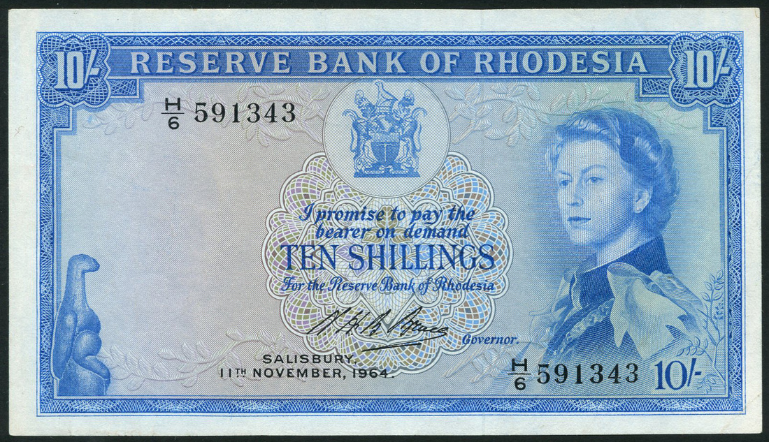 Reserve Bank of Rhodesia, 10/-, 11 November 1964, serial number H/6 591343, blue on multicolour underprint, Elizabeth II at right, arms at top centre, Zimbabwe Bird at low left