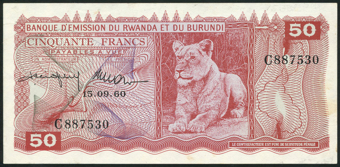 (x) Banque d'Emission du Rwanda et du Burundi, 50 francs, 15 September 1960, serial number C887530, red on multicolour underprint, lioness at centre right, value at top right and low left