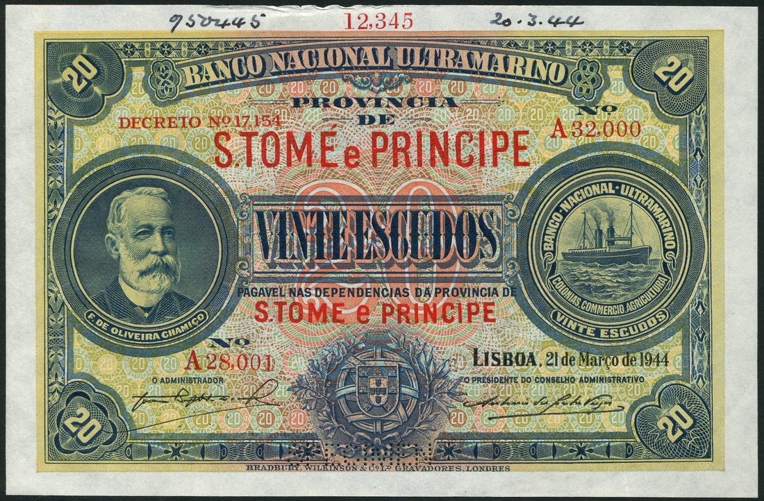 (†) Banco Nacional Ultramarino, St Thomas and Prince, printer's archival specimen 20 Escudos, 21 March 1944, serial number run A28,001 to A32,000, blue on multicoloured underprint, portrait of Francisco Oliveira de Chamico at left, steamship seal at right, arms at lower centre, value in each corner, reverse seated allegorical woman looking out at sailing ships, perforated SPECIMEN