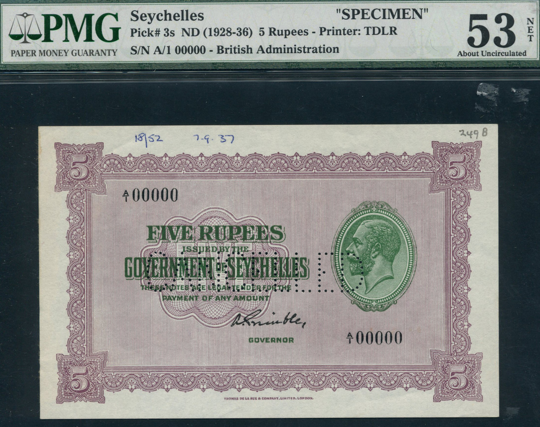(x) Government of Seychelles, specimen 5 rupees, ND (1928-36), serial number A/1 00000, uniface, lilac and green, portrait King George V in circular frame at right, ornate border with value in each corner