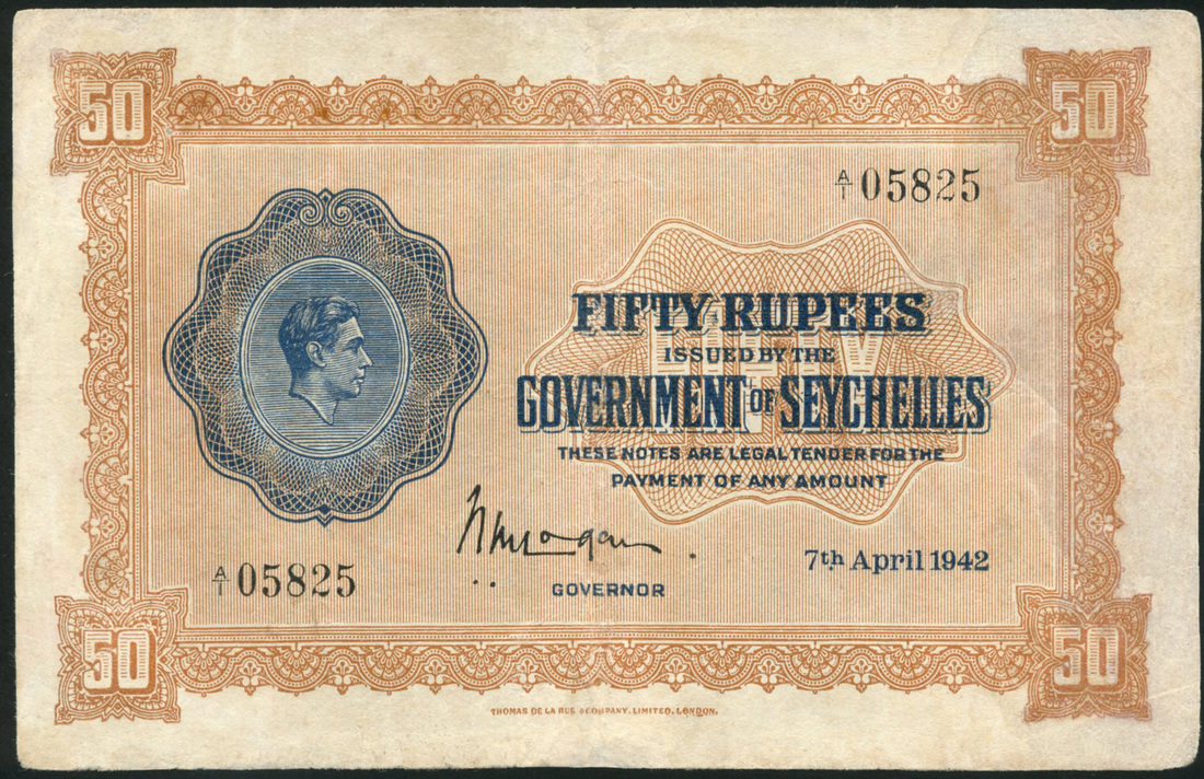 (x) Government of Seychelles, 50 rupees, 7 April 1942, serial number A/1 05825, dark blue on orange-brown underprint, George VI at left, value at each corner