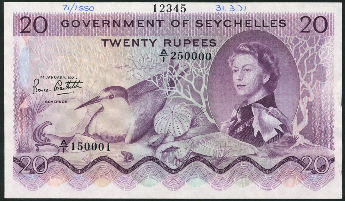 (†) Government of Seychelles, specimen proof 20 Rupees, ND (ca1974), no serial numbers, no signature; also printer's archival specimen 20 Rupees (2), 1 January 1971 and 1 January 1974, serial number runs A/1 150001 to A/1 250000 and A/1 250001 to A/1 350000, signatures Bruce Greatbatch and Colin Hamilton Allan respectively, purple and multicoloured, all Annigoni portrait of Queen Elizabeth II at right, sooty tern and sea shells, reverse value in geometric patterns