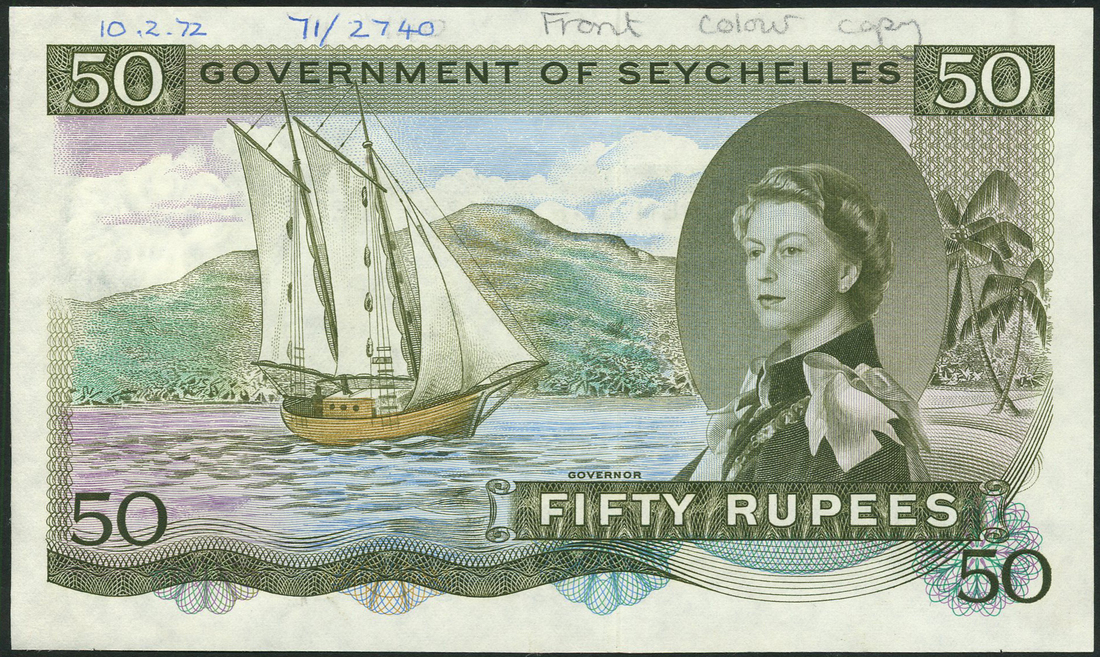 (†) Government of Seychelles, specimen proof 50 Rupees, ND (1972), no serial numbers, no signature, olive-green and multicoloured, Annigoni portrait of Queen Elizabeth II at right, yacht at centre left, reverse geometric patterns