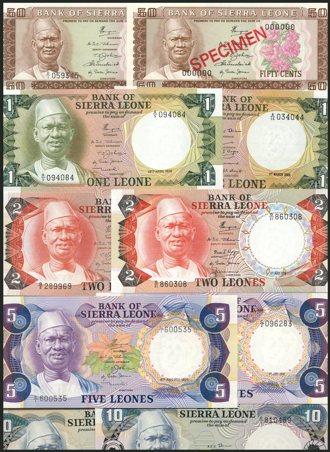 Bank of Sierra Leone, a full set from the 1972-1985 issue, specimen 50 cents, ND, zero serial number, red SPECIMEN overprint, 50 cents (3), prefix D/1, D/6, D/10, 1 leone (3), prefixes A/5, A/16, A/20, 2 leone, B/5, B/31, B/25, 5 leone, C/1, C/2, C/3, C/37, 10 leone E/1, E/20,