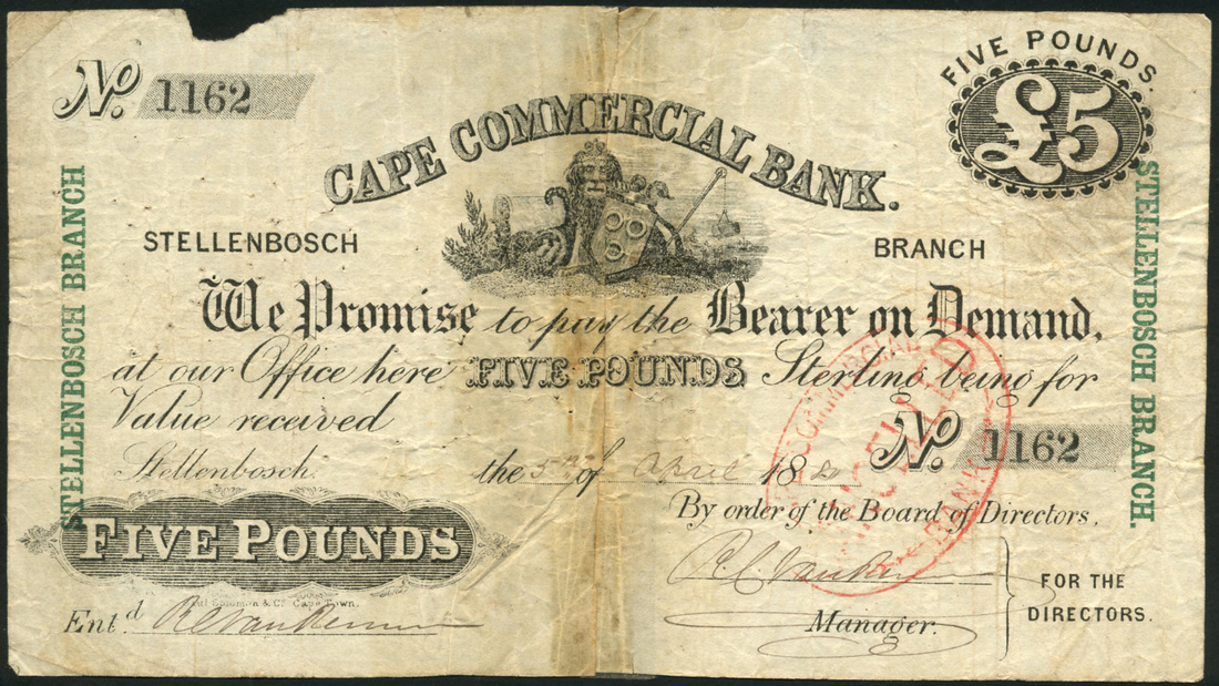 Cape Commercial Bank, £5, Stellenbosch, 5 April 1880, serial number 1162, black and white, lion with coat of arms at top centre, value at top right and low left, reverse with green FIVE at centre