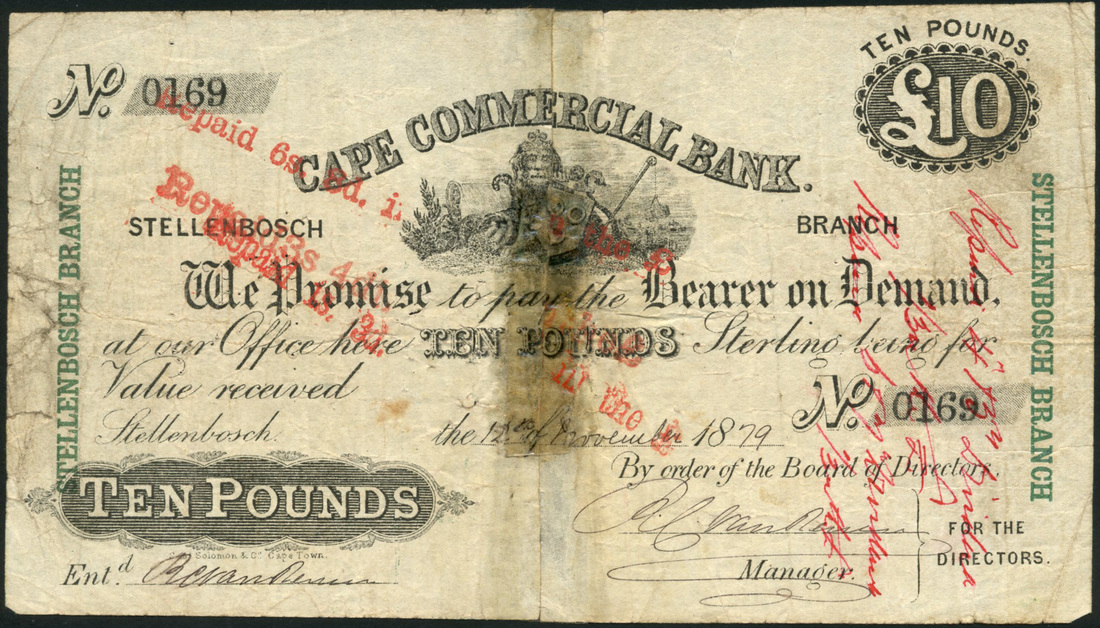 Cape Commercial Bank, £10, Stellenbosch, 12 November 1879, serial number 0169, black and white, lion with coat of arms at top centre, value at top right and low left, reverse with green TEN at centre