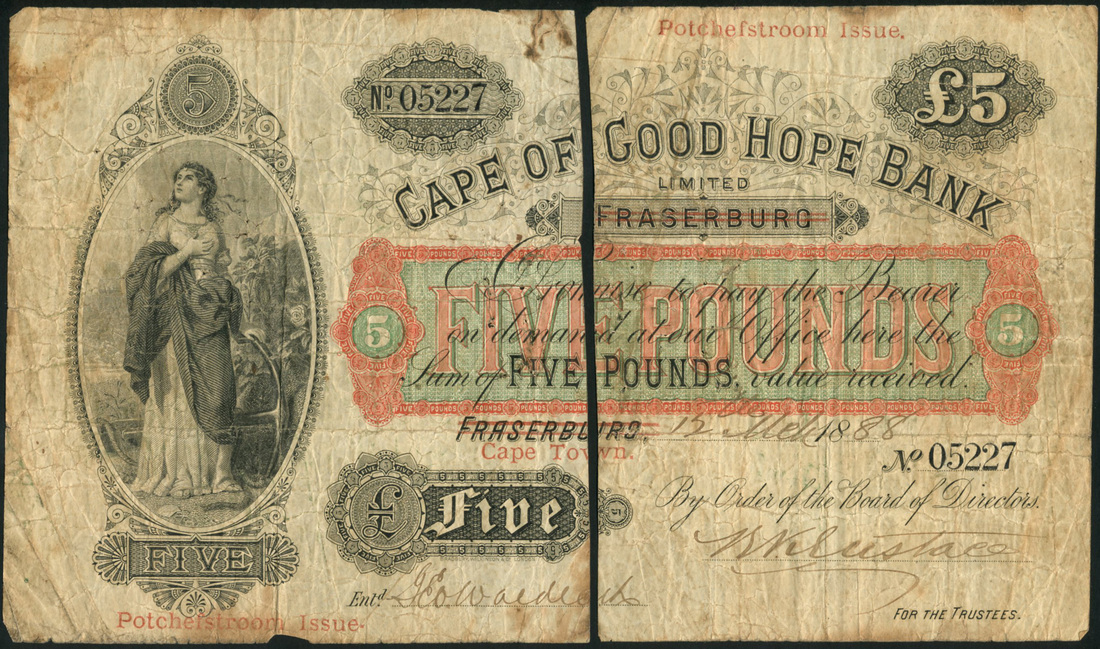 Cape of Good Hope Bank Limited, £5, Cape Town, 12 March 1888, serial number 05227, black, green and red, allegorical maiden at left, value at top right, low left and in underprint at centre, red 'Potchefstroom Issue' in margins