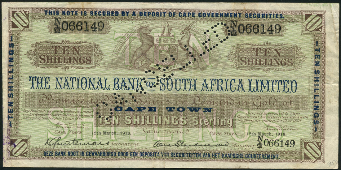 National Bank of South Africa Limited, 10 shillings, Cape Town, 12 March 1918, serial number N/1/2 066149, blue, brown and green, arms at top centre, value at left, right and each corner, perforated CANCELLED