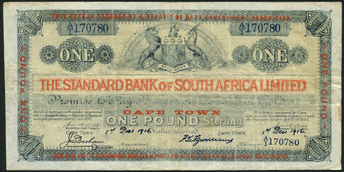 Standard Bank of South Africa Limited, £1, Cape Town, 1 December 1916, serial number A/1 170780 red, blue and green, arms at top centre, value at left, right and each corner