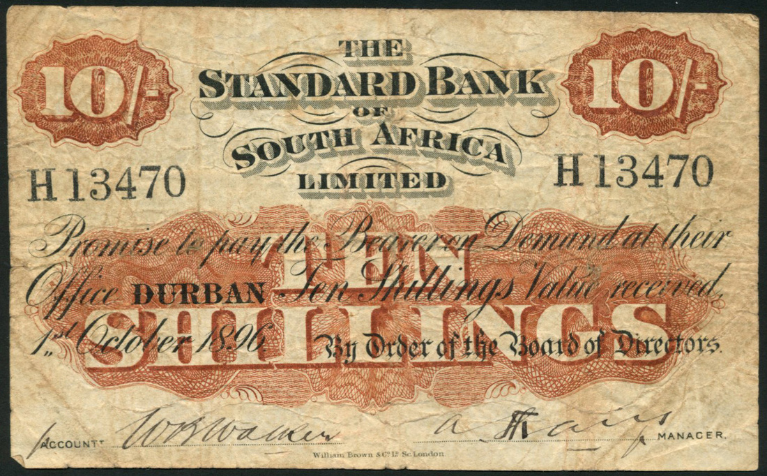 Standard Bank of South Africa Limited, 10 shillings, Durban, 1 October 1896, serial number H13470, black on red-brown underprint, value at centre and top left and right, reverse blue-grey