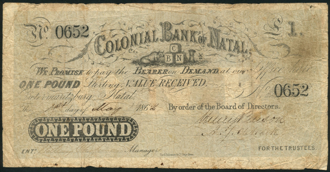 Colonial Bank of Natal, £1, Pietermaritzburg, 1 May 1862, serial number 0652, black and grey underprint, arms at top centre, value at top right and in black tablet at low left