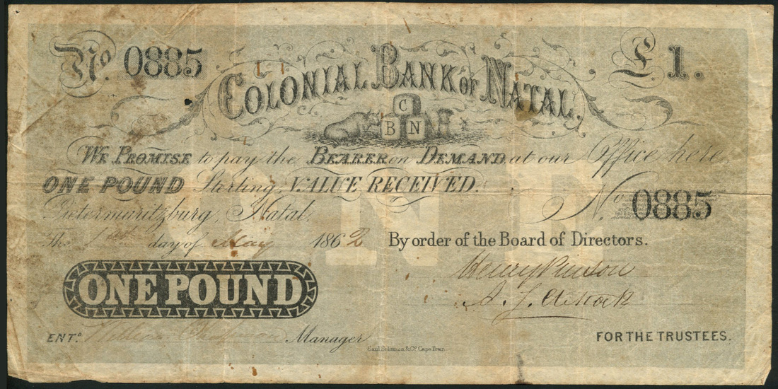 Colonial Bank of Natal, £1, Pietermaritzburg, 1 May 1862, serial number 0885, black and grey underprint, arms at top centre, value at top right and in black tablet at low left
