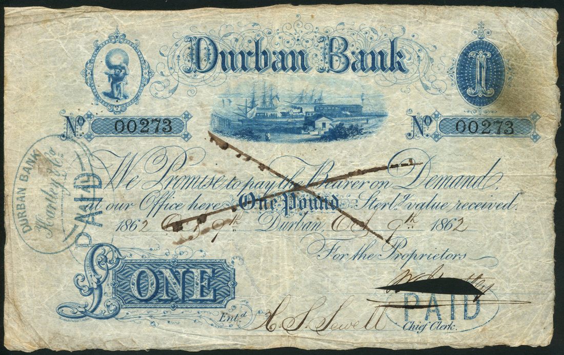Durban Bank, £1, Durban, 9 October 1862, serial number 00273, blue, vignette showing dockside with ships and steam trains at top centre, vignette of Atlas with the world on his shoulders at top left, value at top right and low left, bank stamp at low left