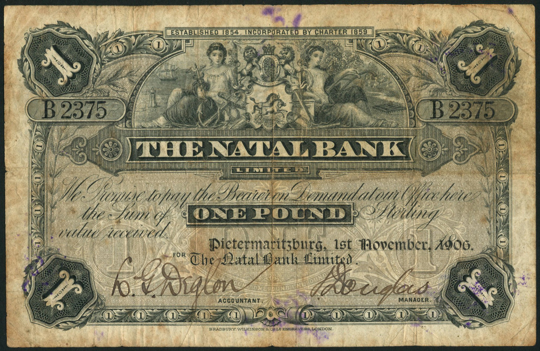 Natal Bank, £1, Pietermaritzburg, 1 November 1906, serial number B2375, black and grey, arms flanked by allegorical maidens at top centre, value at low centre and each corner