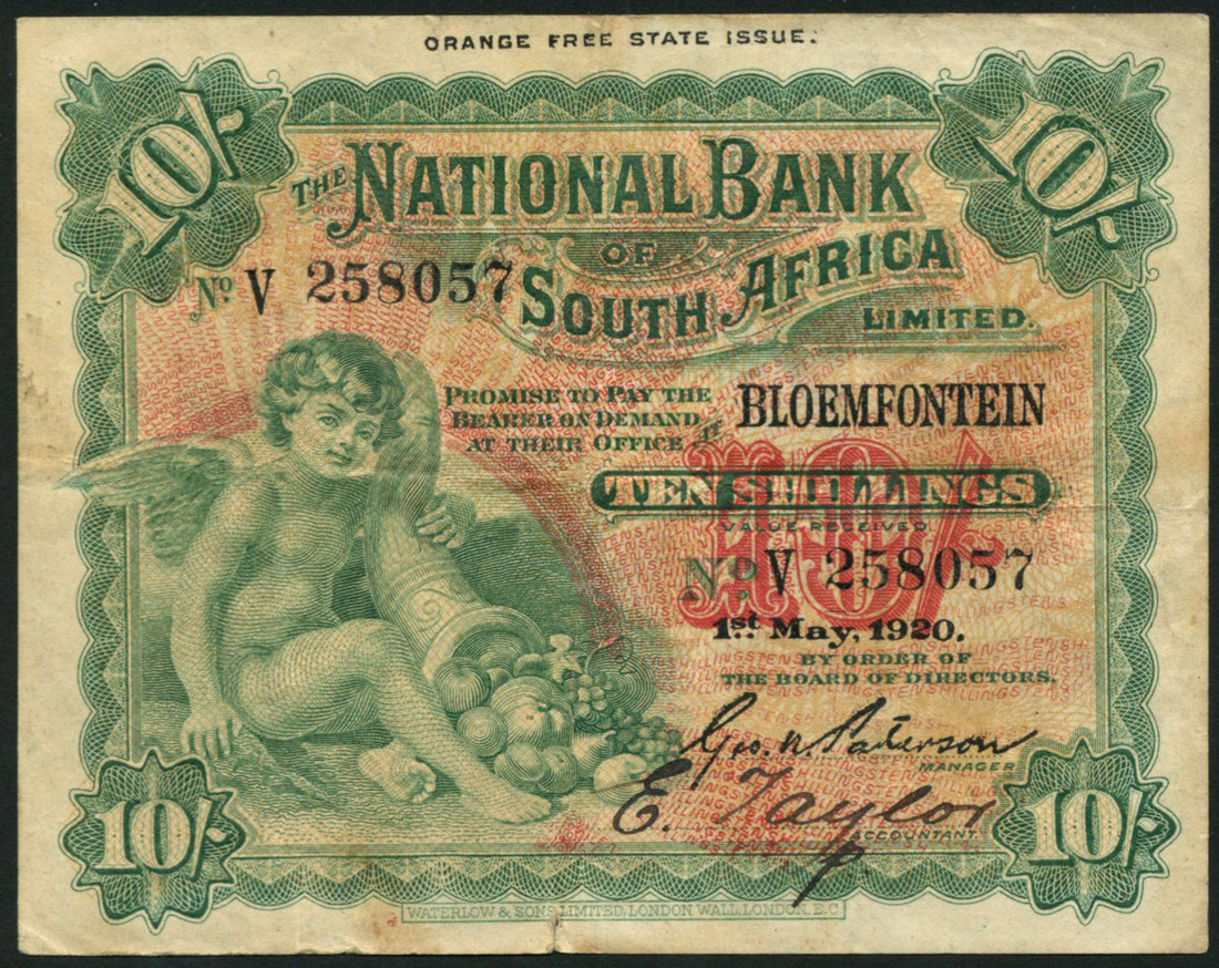 National Bank of South Africa Limited, 10/-, Bloemfontein, 1 May 1920, serial number V258057, green on red and yellow underprint, cherub with cornucopia at left, value at right and each corner, 'Orange Free State Issue' in top margin, reverse blue on yellow, gazelle at centre, value at left and right