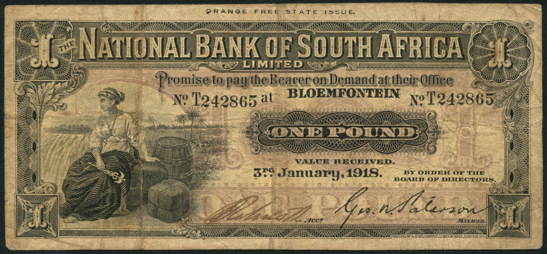 National Bank of South Africa Limited, £1, Bloemfontein, 3 January 1918, serial number T242865, black on red and yellow underprint, allegorical maiden at left, waterfall behind, value at right and each corner, 'Orange Free State Issue' in top margin, reverse blue, map of Africa at centre, value at left and right