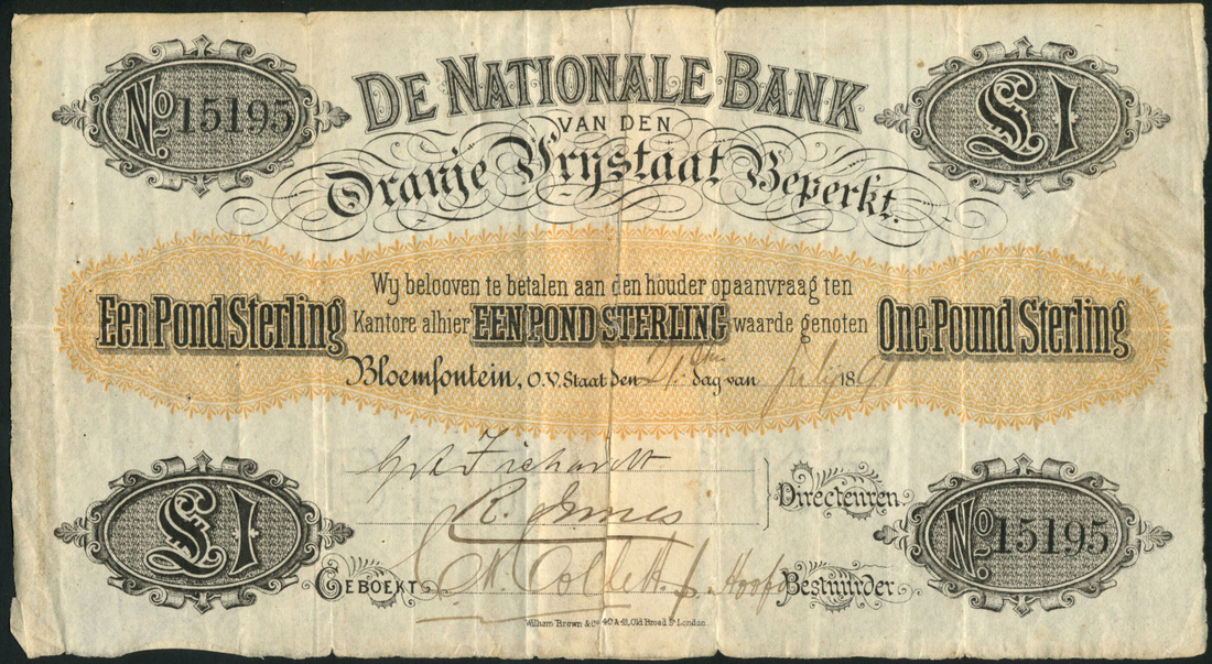 National Bank of Orange Free State, £1, Bloemfontein, 24 July 1891, serial number 15195, black on orange underprint, values at centre, left and right