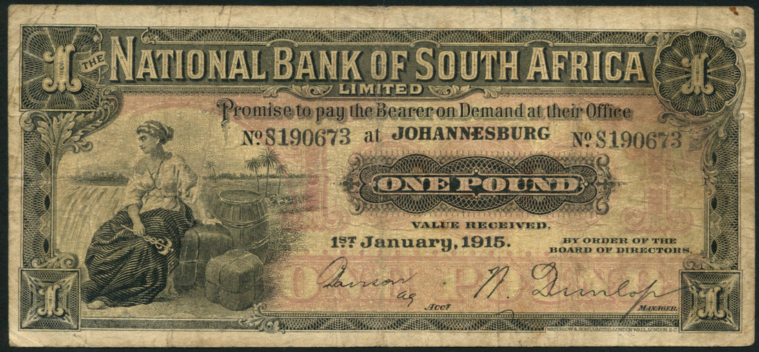 National Bank of South Africa Limited, £1, Johannesburg, 1 January 1915, serial number S190673, black on red and yellow underprint, allegorical maiden at left, waterfall behind, value at right and each corner, reverse blue, map of Africa at centre, value at left and right