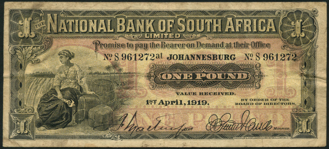 National Bank of South Africa Limited, £1, Johannesburg, 1 April 1919, serial number S961272, black on red and yellow underprint, allegorical maiden at left, waterfall behind, value at right and each corner, reverse blue, map of Africa at centre, value at left and right