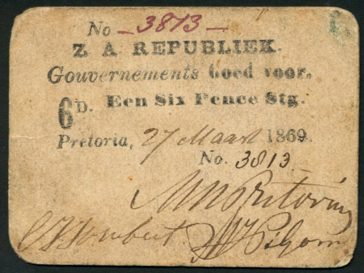 Zuid-Afrikaansche Republiek, 6-Pence, Pretoria, 2 March 1869, serial number 3873, black on vellum, value at left, three manuscript signatures