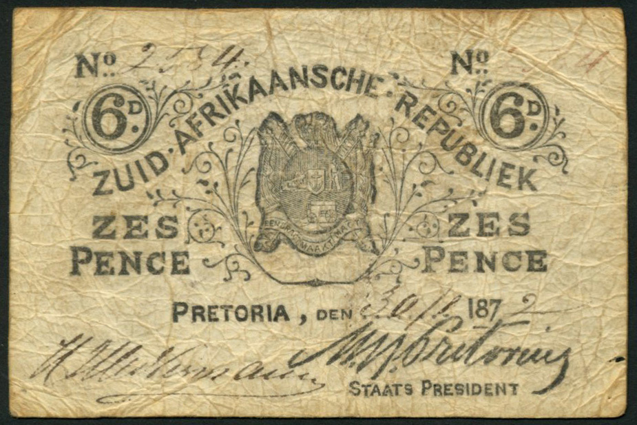 Zuid-Afrikaansche Republiek, 6-Pence, Pretoria, 30 August 1872, serial number 2384, black on vellum, arms at centre, value at top left and right