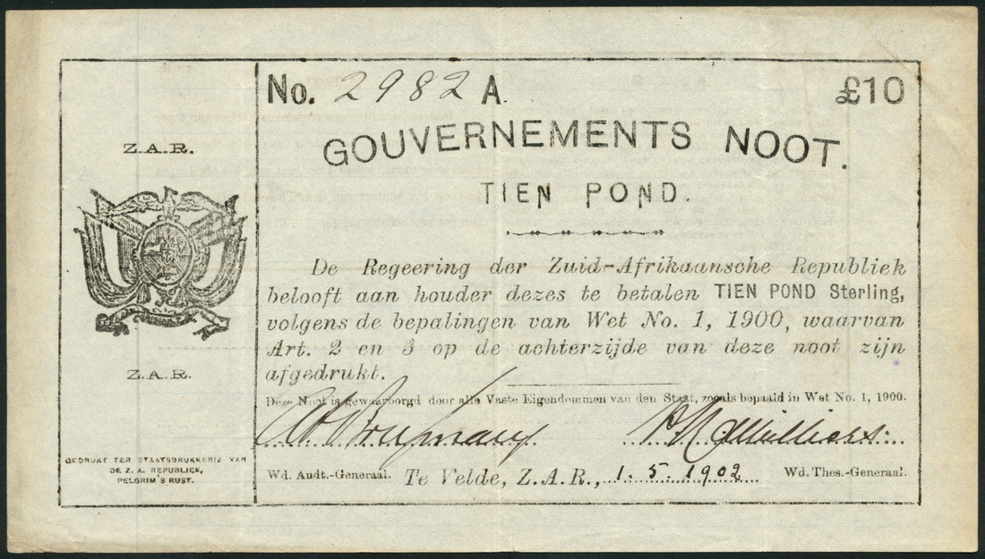 Gouvernements noot, South Africa, Te Velde issues, 1, 5 and 10 pond, 1902, serial numbers 61369A, 6134A and 2982A, brown on lined paper, arms at left, two manuscript signatures below