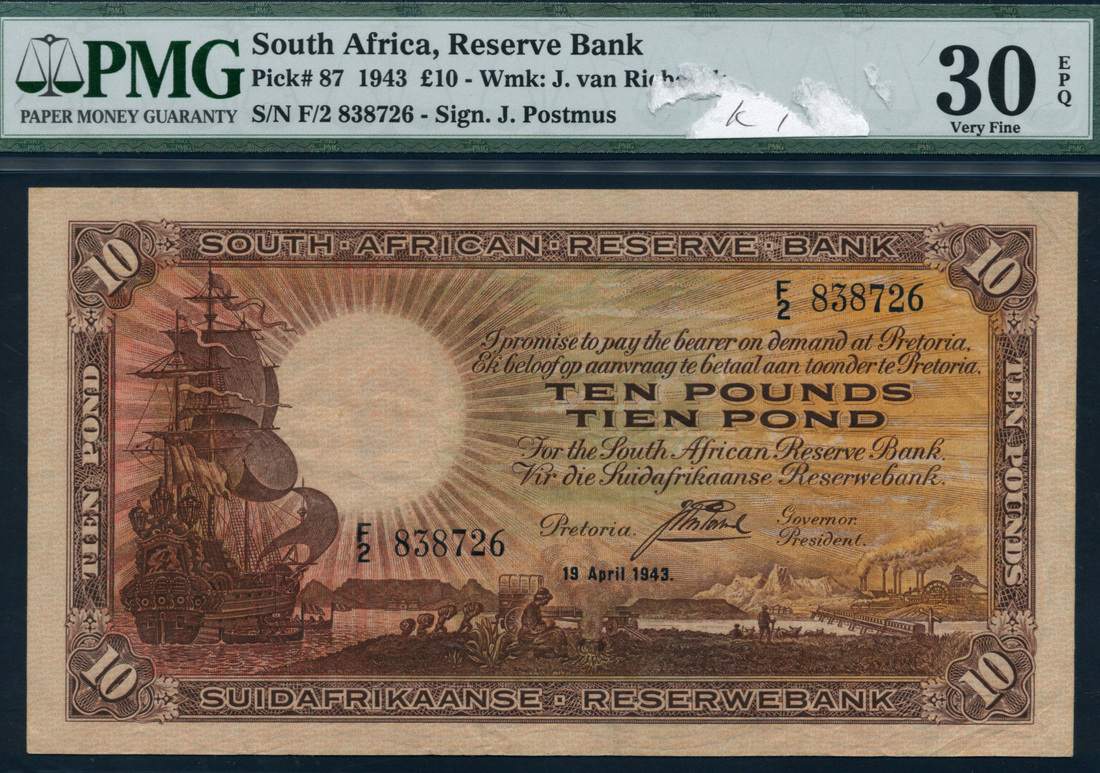 (x) South African Reserve Bank, £10, 19 April 1943, serial number F2 838726, brown and multicolour, sailing ship at left, woman seated at campfire low centre, power station low right, reverse, arms at centre