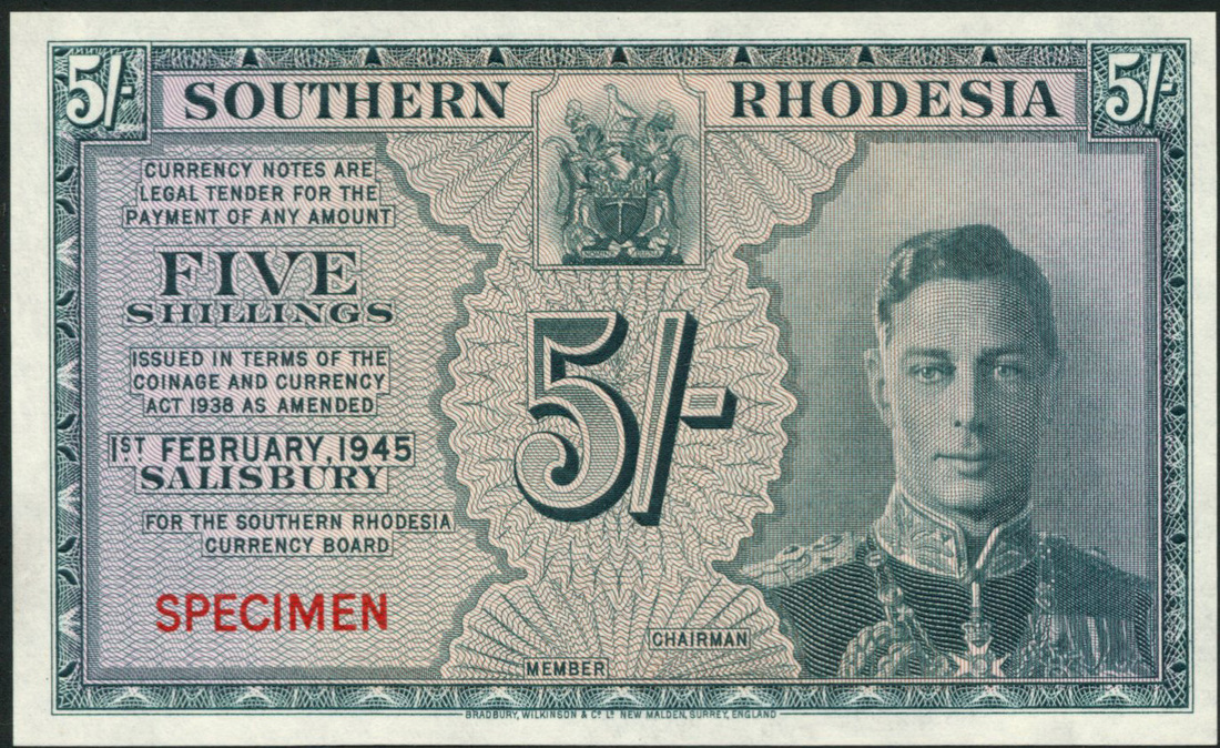 (†) Southern Rhodesia Currency Board, specimen colour trial 5 Shillings, 1 February 1945, no serial numbers, no signatures, blue-green and multicoloured, portrait of King George VI at right, arms at upper centre, reverse value set in ornate guilloche, overprinted SPECIMEN in red on obverse and reverse