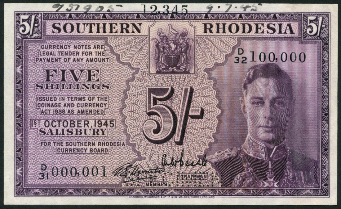 (†) Southern Rhodesia Currency Board, printer's archival specimen 5 Shillings (2), 1 October 1945, serial number run D/31 000,001 to D/32 100,000; 1 January 1948, serial number run D/47 000,001 to D/48 100,000, purple, portrait of King George VI at right, arms at upper centre, reverse value set in ornate guilloche, perforated SPECIMEN