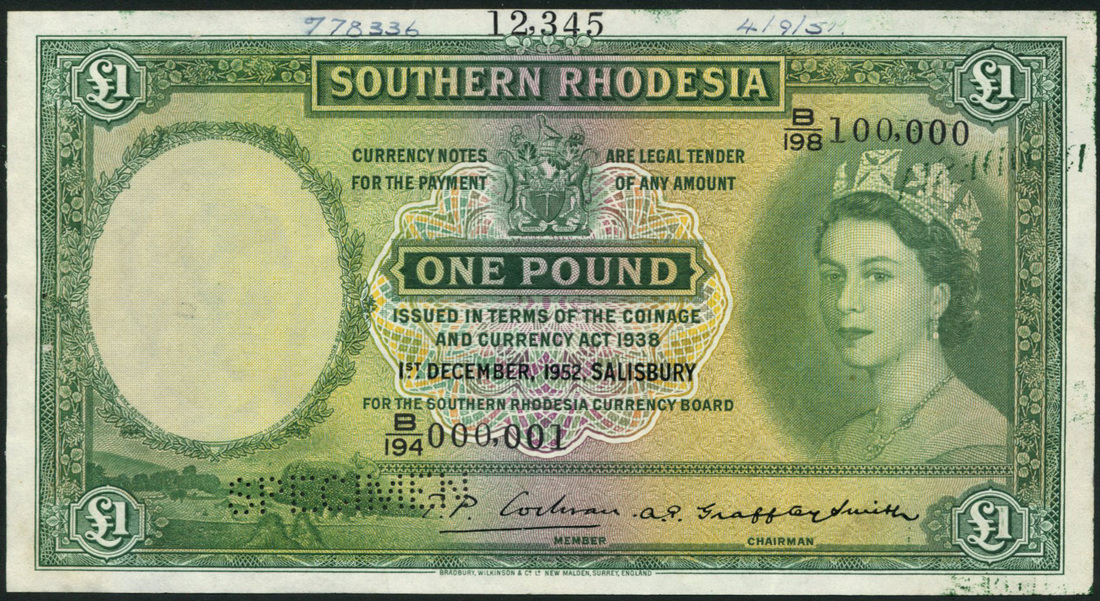 (†) Southern Rhodesia Currency Board, printer's archival specimen £1, 1December 1952, serial number run B/194 000,001 to B/198 100,000, green, portrait of Queen Elizabeth II at right, reverse Zimbabwe ruins, perforated SPECIMEN