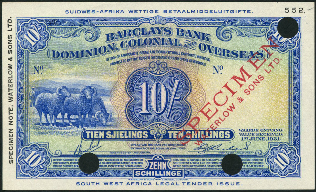 (x) Barclays Bank (D.C.O.), Southwest Africa, colour trial 10 shillings, ND (1931), vibrant blue on multicolour underprint, sheep at left, value at centre and each corner, reverse with ship seal at centre, three cancellation holes and red SPECIMEN WATERLOW & SONS LTD. overprints