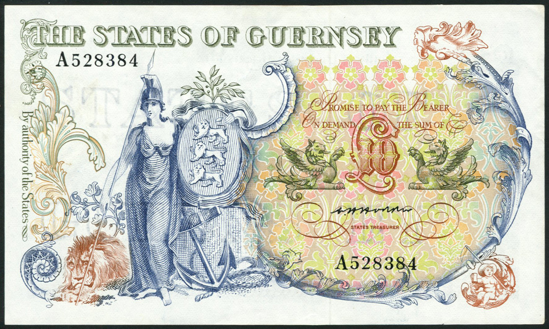 States of Guernsey, £10, ND (1975-), serial number A528384, blue and multicoloured, Britannia at left, Guernsey seal at centre, Hodder signature