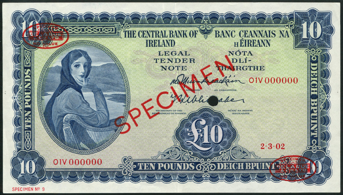 (†) Central Bank of Ireland, a group of specimens of the 1961-77 Issues, all Lady Lavery at left, reverse various river gods, comprising 10 Shillings, 2. 3. 02, serial number O1P 000000, orange; £1, 31. 12. 99, serial number O1A 000000, green; £5, 20. 10. 03, serial number 10W 000000, dark brown: and £10, 2. 3. 02, serial number O1V000000, blue, all overprinted SPECIMEN diagonally in red with two De La Rue specimen ovals on obverse and reverse, punch holes