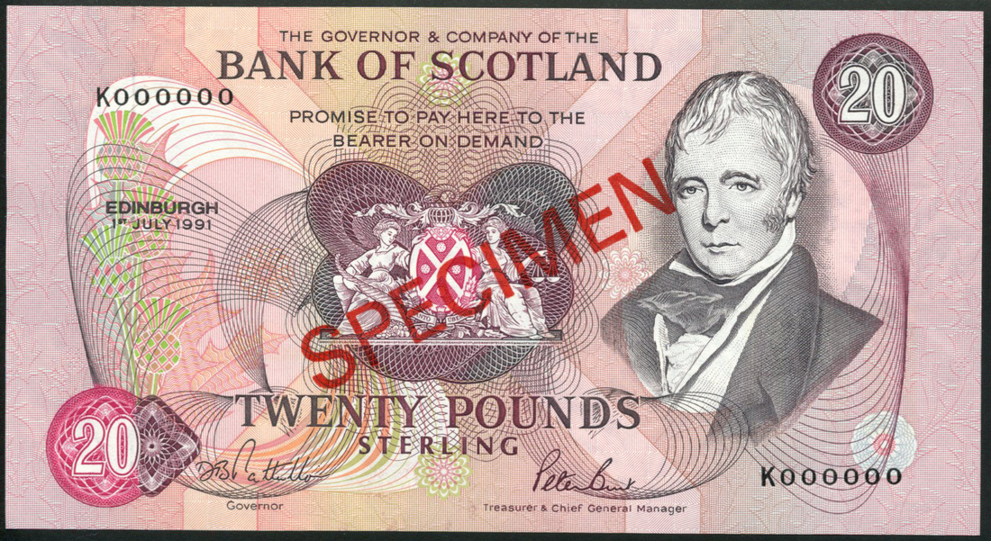 Bank of Scotland, specimen £5 (3), 1991, 1991, 1994 and specimen £20, 1991, first three blue, last black and red, all with Sir Walter Scott at right, all with red SPECIMEN overprint