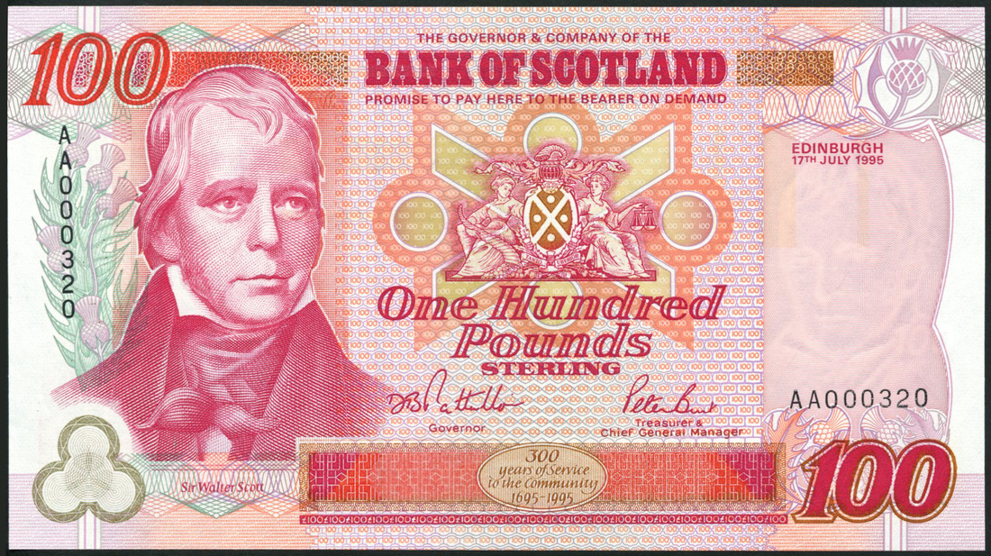 Bank of Scotland, a full set of 1995 issue, including £5, £10, £20, £50 and £100, all with the serial number AA 000320, Sir Walter Scott at right, coat of arms at centre and D.B. Puttullo, P. Burt signatures