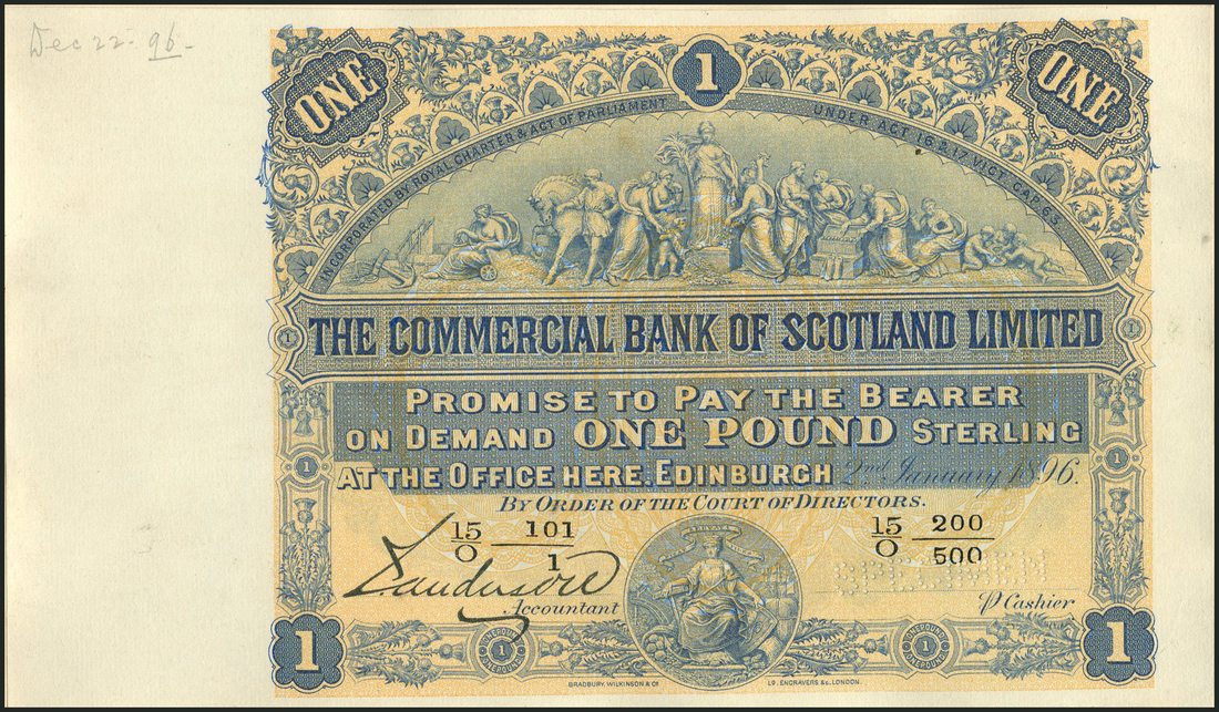 (†) Commercial Bank of Scotland Limited, printer's archival specimen £1, 2 January 1896, black serial number run 15/O 101/1 to 15/O 200/500, printed signature of Accountant at left, blue on buff underprint, sculpted frieze on pediment of Head Office building at upper centre, bank emblem at lower centre, reverse green, Head Office building in Edinburgh set in ornate pattern, perforated SPECIMEN