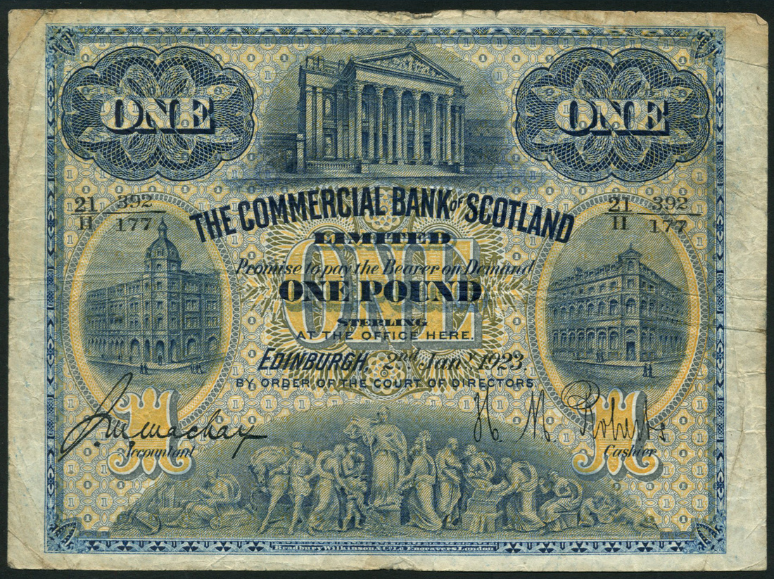 Commercial Bank of Scotland Limited, £1, 2 January 1923, serial number 21/H 392/177, blue and yellow, bank buildings at left and right and top centre, frieze at low centre, value at centre, and each corner