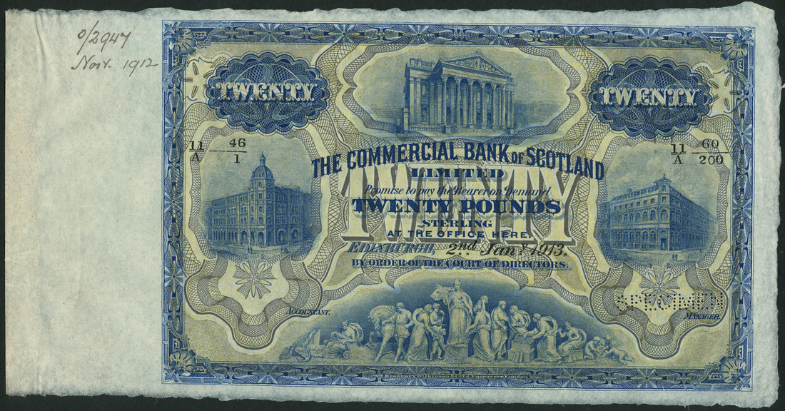 (†) Commercial Bank of Scotland Limited, printer's archival specimen £5, 3 January 1949, serial number run 16E 000001 to 16J 100000, purple; also printer's archival specimen £20, 2 January 1953, serial number run 13I 04001 to 13K 05000, blue, both Lord Cockburn at top centre, allegorical females representing agriculture and trade at left and right respectively, reverse 19th century street scene, bank building at centre, perforated SPECIMEN