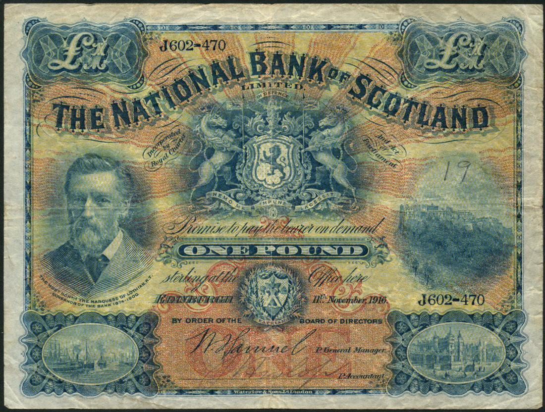 National Bank of Scotland Limited, £1, 11 November 1916, J602-470, blue on yellow and red underprint, Marquess of Lothian at left, arms at centre, Edinburgh Castle at right