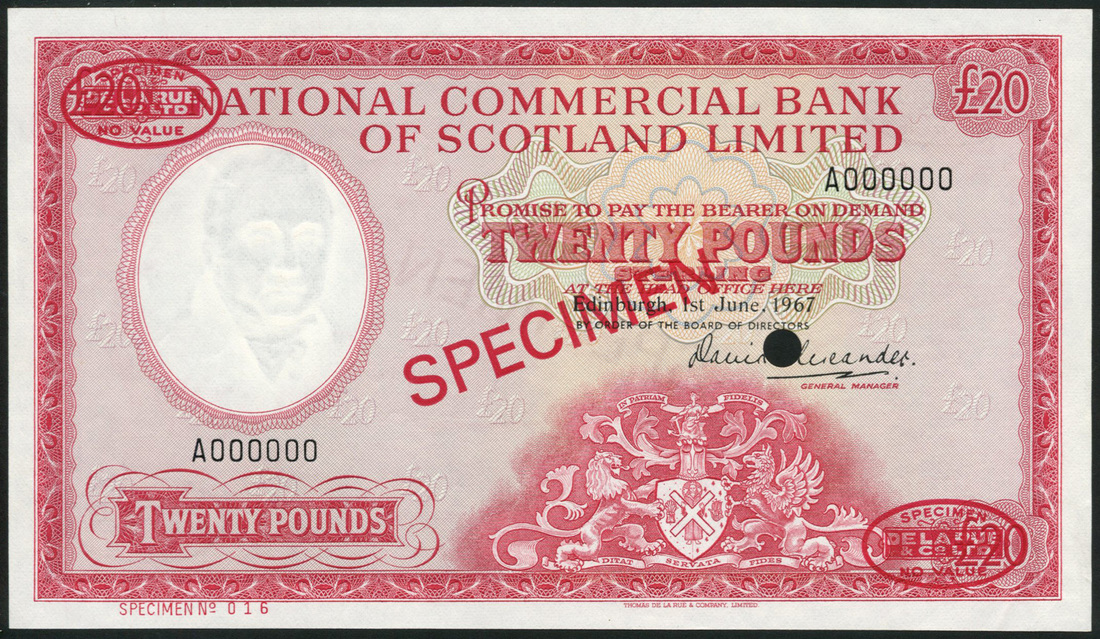 (†) National Commercial Bank of Scotland Limited, specimen £20, 1 June 1967, serial number A000000, red and multicoloured, arms at lower right, reverse Forth Rail Bridge, overprinted SPECIMEN in red with two De La Rue ovals on obverse and reverse, one punch hole