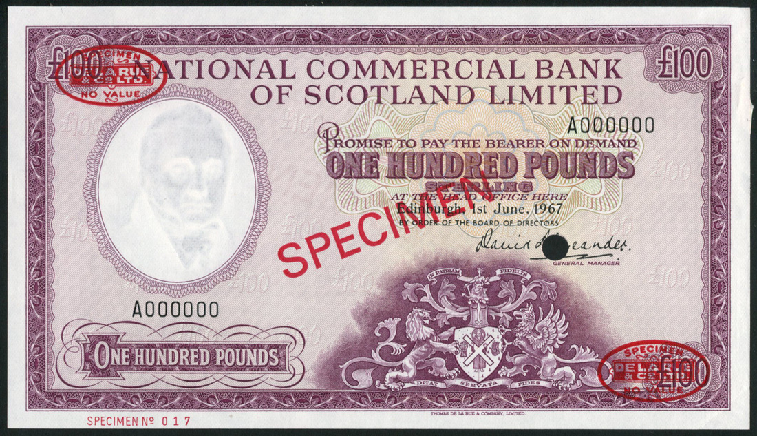 (†) National Commercial Bank of Scotland Limited, specimen £100, 1 June 1967, serial number A000000, purple and multicoloured, arms at lower right, reverse Forth Rail Bridge, overprinted SPECIMEN in red with two De La Rue ovals on obverse and reverse, one punch hole