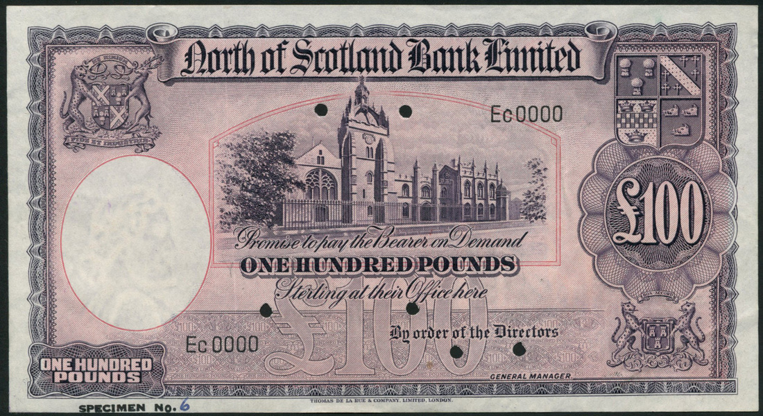 (†) North of Scotland Bank Limited, specimen £20, 1 July 1949, serial number PT 00000, green on lilac underprint; also specimen £100, ND (1938-49), serial number Ec0000, purple on lilac underprint, both Kings College, Aberdeen at upper centre, coats of arms in three corners, reverse coat of arms set in ornate pattern, the first perforated CANCELLED, five punch holes, the second six punch holes